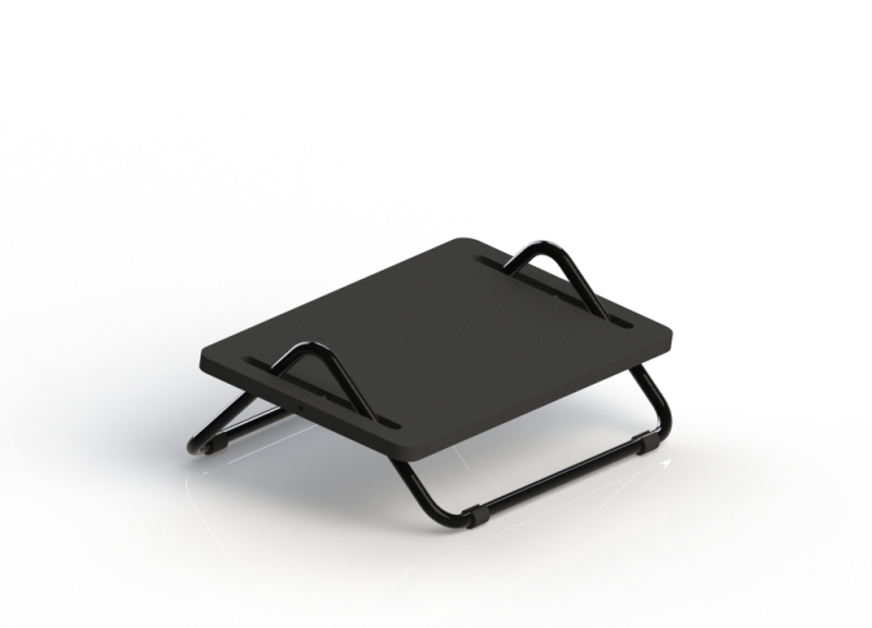 Apoio para pés com inclinação ajustável, fabricado em tubo 5/8" e apoio em MDF, possui pino trava para evitar a retirada do apoio da estrutura.